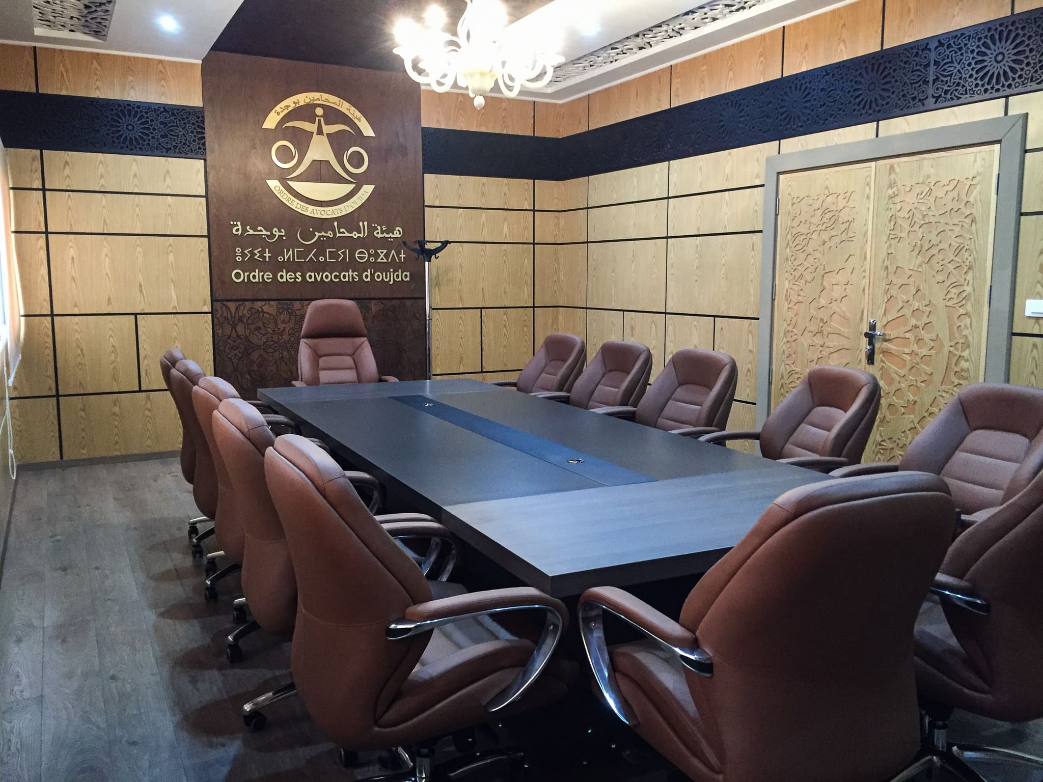 Cabinet d’avocat – Oujda : table de réunion, cloison bois acoustique, bibliothèque sur mesure.